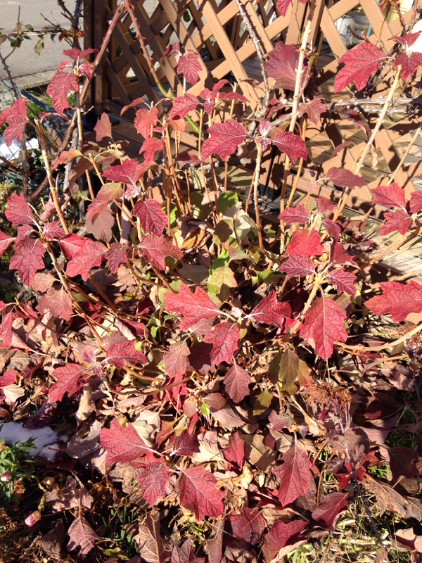 真っ赤で綺麗に紅葉していた柏葉アジサイが落葉=3